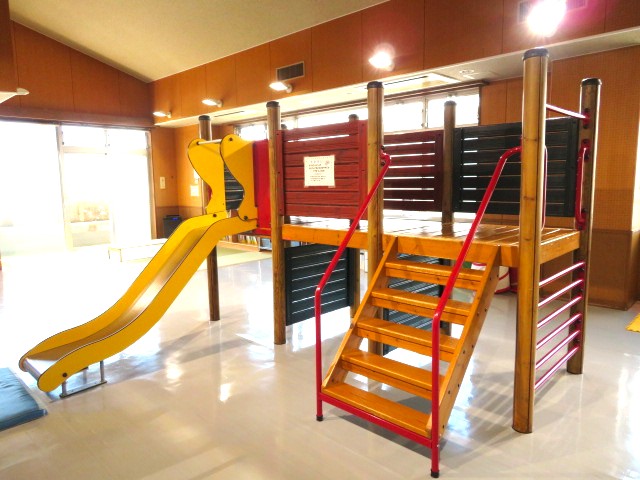滑り台つきの大型複合遊具があります。オモチャを持って台の上に登らないでください。