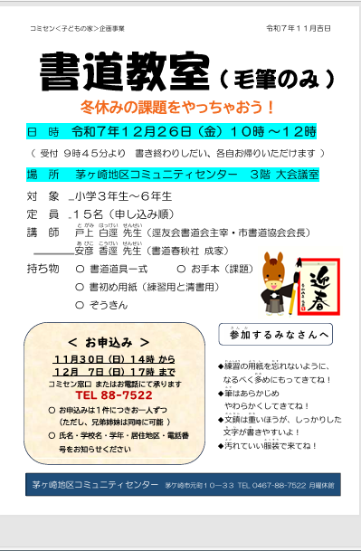 書道教室を開催します。冬休みの課題をやっちゃおう!【茅ヶ崎コミセン】