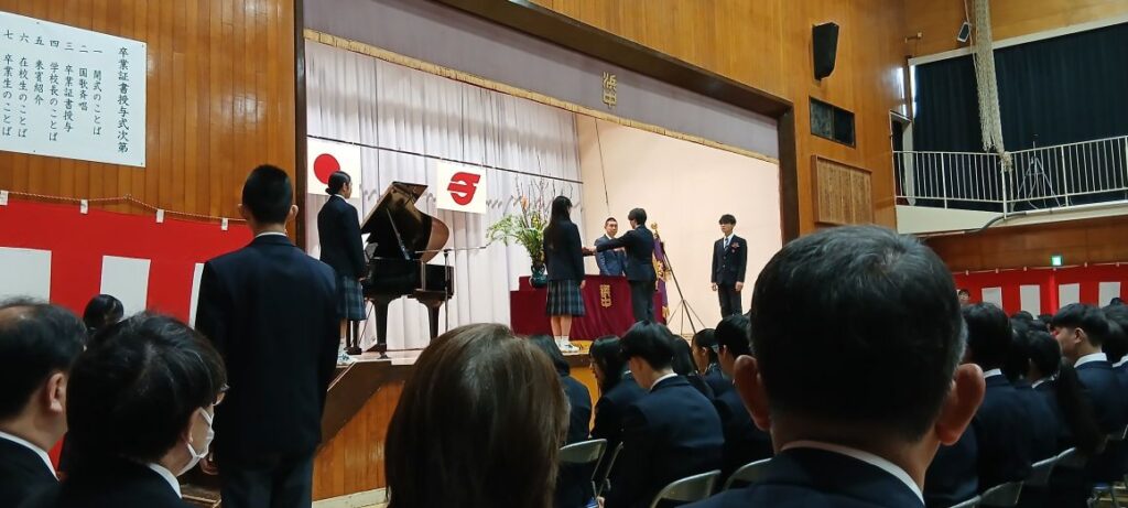 卒業生代表の宇佐美さんは、「体育祭で仲間と団結できて達成感を感じた。うれしい、悲しい、楽しい思いを共有した仲間は一生の宝物。先生は親身になって寄り添っていただいた。家族は笑顔で毎日送り出してくれた。夢を応援してくれた。困ったときの一番の見方だった。これから夢へ向かい別々の道に進むが感謝を忘れずそれぞれの道を堂々と歩んでいきます。」 と力強く宣言されました。