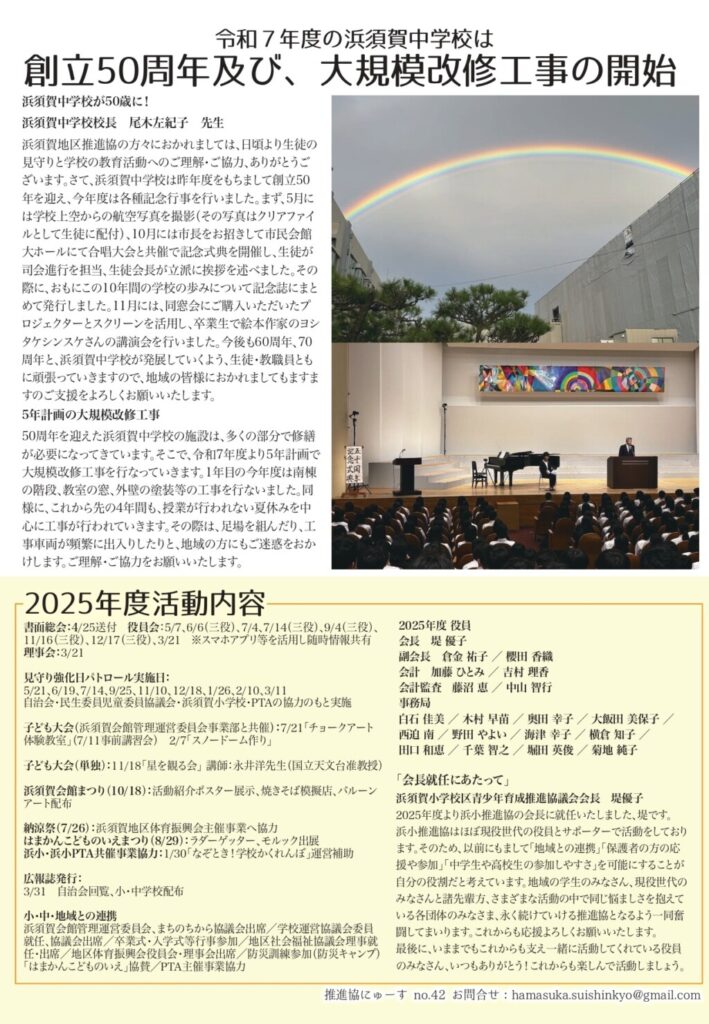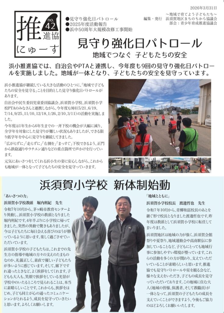 2026-03-22 / 最終更新日時 : 2026-03-22 田中 英一 00_お知らせ浜須賀/緊急連絡 『推進協にゅーす No.42号』を発行しました。 青少年育成推進協議会より、推進協ニュース No.42号を発行いたしました。見守り強化パトロール、浜須賀小学校 新体制始動など、多くの記事を掲載しています。 Bluesky