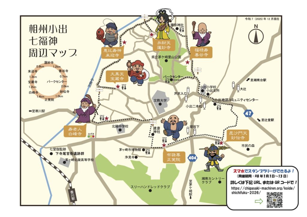 茅ヶ崎市の北部、懐かしい里山の風景が残る小出一帯に、相州小出七福神が祀られています。全行程は約 10 km、 所要時間3時間程の手頃なコースです。 楽しく歩けば、気持ちが UP、体力も UP しますよ!