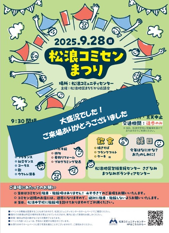 ようこそ“松浪まちぢから協議会”のホームページへ 日常に貢献:「見るから使うへの進化」スマホで:「あなたのポケットに松浪ホームぺージを!」 お知らせ松浪 食欲の秋です!美味しい野菜はいかがでしょうか?10月の朝市は10月5日(日)、19日(日)朝8時からです。 浜竹・出口町・美住町ひばりヶ丘・松浪 常盤町・富士見町・緑が浜・汐見台 まちぢから 自治会 諸団体 PTA まちぢから ・会長挨拶・規 約・役員一覧・広報紙:まつなみだより・運営委員会議事録・自治会長部会・市民安全部会・防災対策部会・広報委員会・イベントの記録・まちぢから協議会 書庫・茅ヶ崎市まちぢから協議会連絡会 自治会 浜竹一丁目自治会浜竹二丁目自治会浜竹三丁目自治会浜竹四丁目自治会松浪一丁目自治会松浪二丁目自治会富士見町自治会LG富士見町自治会常盤町自治会緑が浜自治会汐見台自治会出口町自治会ひばりが丘自治会美住町自治会 諸団体 社会福祉協議会民生児童委員協議会老人クラブ地域包括支援センター:さざなみ体育振興会スポーツ少年団 PTA 松浪中学校ホームページ松浪小学校ホームページ緑が浜小学校ホームページ汐見台小学校ホームページ青少年育成推進協議会 ー 松浪小区 青推協 ー 緑が浜小区 推進協 ー 汐見台小区 推進協松浪中 PTA松浪小 PTA緑が浜小 PGT汐見台小 PTA トピックス まつなみだより35号画像をクリックすると全ページ表示されます。 なみっこ おはなし会松浪コミセン内 子どもの家「なみっこ」では、「松浪開き読みの会」の方々による「おはなし会」を開催しています。絵本の読み聞かせだけではなく、懐かしいわらべうたをいっしょに歌ったり、手遊びで親子で触れ合ったりと、お子さんはもちろんママ・パパが共に楽しめる催しです。穏やかでゆったりとした時間を一緒に過ごしませんか?予約はいりませんので、お気軽にいらしてください。 コミセン寄席 松浪まちぢから協議会のお知らせ 祝!!全国大会出場!松浪中学校陸上競技部 2025年8月8日 5/18(日)こみせん寄席2025 満員御礼 2025年6月3日 松浪コミセンまつり2025参加団体募集⇒6/15締め切りました 2025年5月15日 春のさくらコンサート2025満員御礼 2025年5月2日 5/18(日)こみせん寄席「落語会」開催! 2025年4月19日 3/30(日)春のさくらコンサート開催します 2025年2月23日 コミセンのお知らせ コミセンだより 第103号 2025年8月11日 祝!!全国大会出場!松浪中学校陸上競技部 2025年8月8日 7/12(土)こどもたいこワークショップ大盛況でした 2025年8月8日 コミセンだより 第102号 2025年6月20日 5/18(日)こみせん寄席2025 満員御礼 2025年6月3日 コミセンだより 第101号 2025年5月27日 自治会便り 松浪地区体育祭 10月12日(日) 2025年10月4日 浜四便り 10月 2025年10月3日 9月 浜四便り 2025年9月8日 浜竹四丁目自治会_紙ベースの各種申込書、届一式(2025/09/04) 2025年9月4日 浜二だより 2025年8月15日 第81号 2025年8月30日 浜四 敬老のお祝い 訂正版 2025年8月20日 イベントギャラリー 松浪まちぢから協議会・部会 ・会長挨拶・規 約 ・役員一覧 ・広報紙:まつなみだより ・運営委員会議事録 ・自治会長部会 ・市民安全部会 ・防災対策部会 ・広報委員会 ・イベントの記録 ・まちぢから協議会 書庫 ・茅ヶ崎市まちぢから協議会連絡会 自 治 会 浜竹一丁目自治会浜竹二丁目自治会浜竹三丁目自治会浜竹四丁目自治会松浪一丁目自治会松浪二丁目自治会富士見町自治会LG富士見町自治会常盤町自治会緑が浜自治会汐見台自治会出口町自治会ひばりが丘自治会美住町自治会 諸 団 体 社会福祉協議会民生児童委員協議会老人クラブ地域包括支援センター:さざなみ体育振興会スポーツ少年団 学校、PTA、推進協 松浪中学校ホームページ 松浪小学校ホームページ 緑が浜小学校ホームページ 汐見台小学校ホームページ 青少年育成推進協議会 ー 松浪小区 青推協 ー 緑が浜小区 推進協 ー 汐見台小区 推進協 松浪中 PTA 松浪小 PTA 緑が浜小 PGT 汐見台小 PTA Bluesky