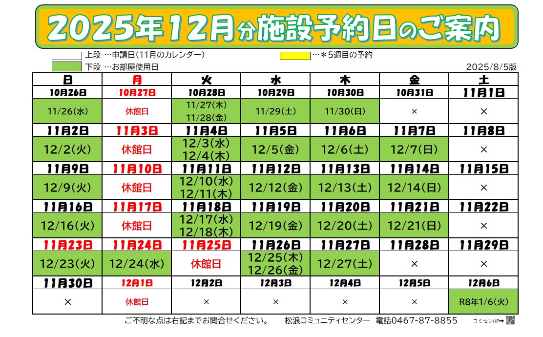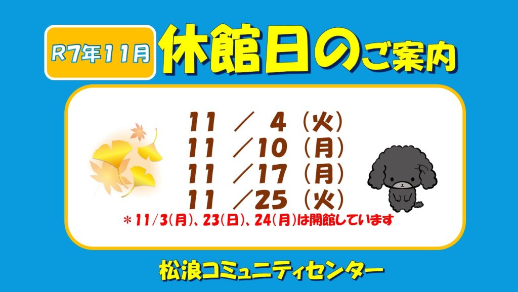 検索: 施設予約日早見表⇒ 当月 次月 ●●10月の開催日●●■朝 市 10/5(日) 19(日)8:00~9:00■卓球開放 10/19(日) 10:30~12:15 ひと枠45分 予約制 ☎87-8855■なみっこおはなし会 10/28(火) 11:00~ 予約は必要ありません 食欲の秋です!美味しい野菜はいかがでしょうか?10月の朝市は10月5日(日)、19日(日)朝8時からです。 松浪コミセンまつり 大盛況でした!! コミセンだより 第103号2025年8月11日 祝!!全国大会出場!松浪中学校陸上競技部2025年8月8日 7/12(土)こどもたいこワークショップ大盛況でした2025年8月8日 コミセンだより 第102号2025年6月20日 5/18(日)こみせん寄席2025 満員御礼2025年6月3日 ●●●松浪コミュニティセンター 各取扱業務時間●●●・開館時間 9:00~21:00(7~9月21:30)・なみっこ 9:00~17:00(11~1月16:30)*12:00~13:00おひるやすみのため閉室・印 刷 9:00~19:00・図 書 10:30~17:00 コミセンカレンダー Bluesky