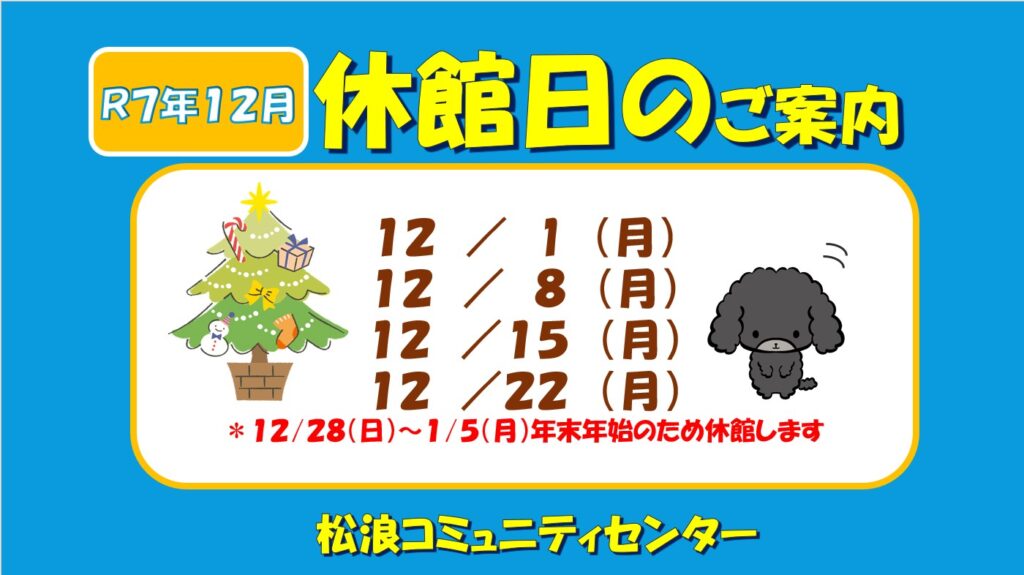 検索: 施設予約日早見表⇒ 当月 次月 ●●10月の開催日●●■朝 市 11/2(日) 16(日)8:00~9:00■卓球開放 11/16(日) 10:30~12:15(ひと枠45分)予約制 ☎87-8855■なみっこおはなし会 11/21(金) 11:00~ ※予約は必要ありません 食欲の秋です!美味しい野菜はいかがでしょうか?10月の朝市は10月5日(日)、19日(日)朝8時からです。 今年もチュ―リップの球根植え付けの季節となりました!!皆さまにご協力いただき、コミセンの花壇には毎年みごとなチューリップが咲き誇ります。皆さまのご参加をお待ちしています❤ 松浪コミセンまつり 大盛況でした!! 松浪コミセンまつり2025開催報告!2025年10月13日 コミセンだより 第103号2025年8月11日 祝!!全国大会出場!松浪中学校陸上競技部2025年8月8日 7/12(土)こどもたいこワークショップ大盛況でした2025年8月8日 コミセンだより 第102号2025年6月20日 ●●●松浪コミュニティセンター 各取扱業務時間●●●・開館時間 9:00~21:00(7~9月21:30)・なみっこ 9:00~17:00(11~1月16:30)*12:00~13:00おひるやすみのため閉室・印 刷 9:00~19:00・図 書 10:30~17:00 コミセンカレンダー Bluesky