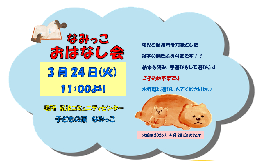 子どもの家「なみっこ」 なみっこについて ・・おしらせ・・ なみっこ2025年5月の壁飾り2025年5月21日 なみっこ2024年8月の壁飾り2024年9月14日 なみっこ2024年6月の壁飾り2024年9月14日 なみっこの動画が見れます♪右の“にゃあ”をクリックして下さい!→→→Backnumberはこちら☞ ~ なみっこ ギャラリー ~ ひらがななにがあるかな?数え方わかるかな?壁に魚が泳ぎ始めました♪徐々に仲間が増えるかも。。。? なみっこについて なみっこは、乳幼児から小学生までの子どもたちが安心して遊べる空間を提供しています。平日の午前中は小さいお子さんとお母さん・おじいちゃん・おばあちゃんなど、午後3時ごろからは小学生がたくさん遊びに来ます。土日はお父さんの姿も多く見られます。【利用対象】 小学生と幼児(小学生未満のお子様は必ず大人が同伴してください)【利用時間】 9時~17時00分*12時~13時は昼休み(11月~1月9:00~16:30)【休日】 月曜日(月曜日が休日の場合は、その翌日の平日)、年末年始、松浪コミュニティセンターの休みと同じ。【利用方法】 ご利用時に名前、性別、学校名、学年または年齢、連絡先、入室時間を記入。お帰りの際に退室時間をご記入ください。 【なみっこのルール】飲み物(ジュース以外)は持ち込みできます。食事は出来ません。(外のフリースペースをご利用下さい)おもちゃの持ち込みはできません。施設内のおもちゃをご利用下さい。(携帯ゲーム、DS、トレーディングカードもできません)幼児連れの保護者の方はお子様から目を離さないようお願いします。保護者の方のミーティングや手芸、読書などは外のフリースペースをご利用下さい 【授乳室・おむつ替え】ご利用の際は、スタッフにお声がけくださいゴミ(オムツを含む)はお持ち帰りください。 絵本のコーナーが出来ました♪ 【なみっこじゆうちょう】作りました!楽しかったこと、あったらいいな、こうしてほしい、などなど自由にご記入下さい。 Bluesky