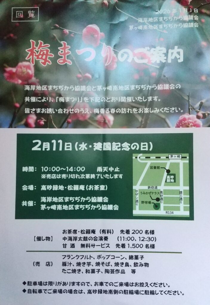 2026年1月18日 / 最終更新日時 : 2026年1月18日 UNNO お知らせ 2026.2/11(祝) 高砂緑地 梅まつり開催のお知らせ 今年も恒例の梅まつりを開催します 日時:2026年2月11日(祝日) 場所:高砂緑地(JR東海道茅ヶ崎駅南口から徒歩5分) DSC_0325